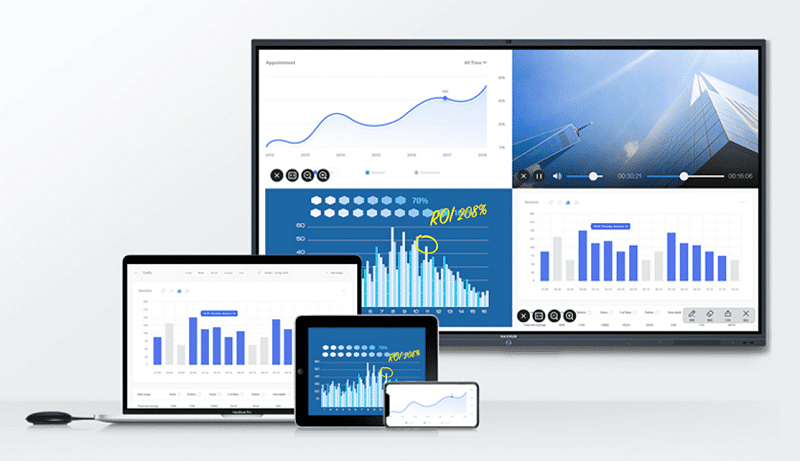 MAXHUB丝瓜视频下载网址能代替投影儀,實現無線投屏。將電腦內容投屏到大屏上,隻需要一個無線傳屏器就可以了。輕輕一按,就將會議內容投屏到丝瓜视频下载网址上。手機、平板直接無線傳屏。