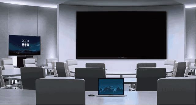 MAXHUB小間距LED 一體機是大屏,尺寸分別有110、 138 、165 、 220,根據會場大小進行選擇。一體化 設計,使用更加輕鬆,僅一根電源線一鍵開機即用,自帶安卓係統和歡迎頁麵,能無線傳屏。